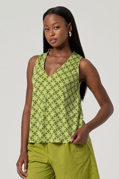 Top sin mangas con escote pico delantero y espalda recta. Diseño estampado de tejido elástico y poliéster reciclado. Top estampado elástico.