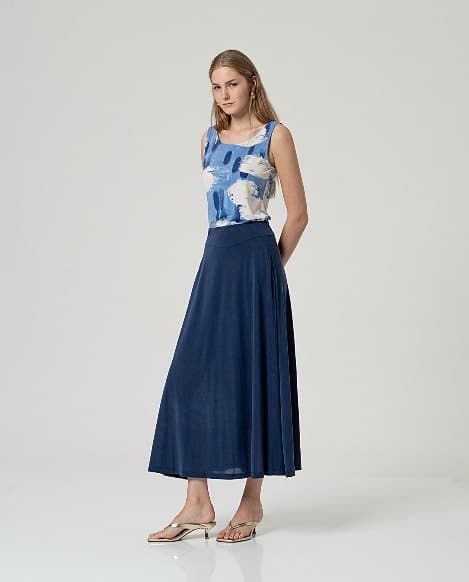 Maxi falda de tiro alto y silueta evasé. Diseño de líneas limpias con bajo amplio. Confeccionada en tejido fluido con modal y poliéster. Maxi falda amplia tejido fluido,