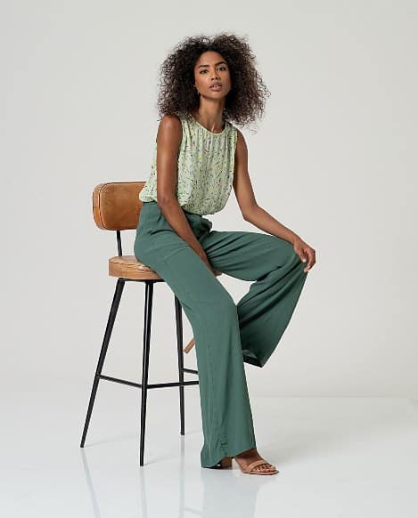 Pantalón de tiro medio con pierna recta. Diseño con cierre frontal de cremallera y botón, cintura elástica en la parte posterior y bolsillos laterales. Confeccionado en 100% viscosa EcoVero. Pantalón EcoVero tiro medio recto.
