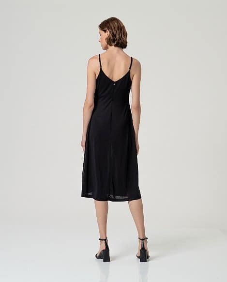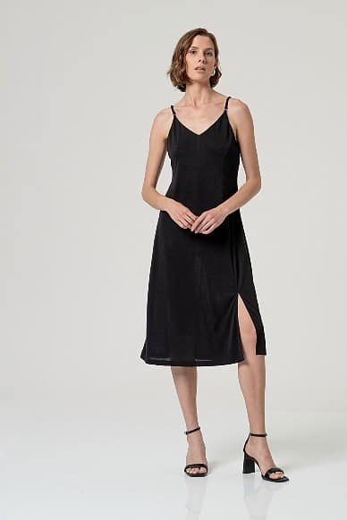 Vestido midi liso con tirantes finos y escote pico. Diseño recto con abertura lateral y largo midi. Confeccionado en tejido fluido con modal y poliéster. Vestido midi fluido con abertura.